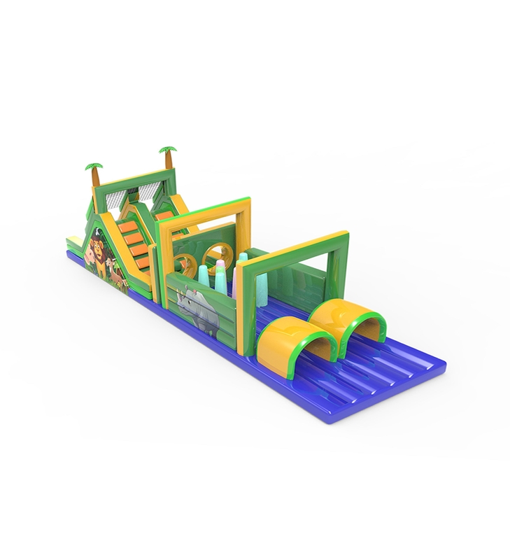 Deze levendige opblaasbare obstakelbaan heeft een speelse jungle thema met dierlijke decoraties zoals leeuwen en neushoorns.tunnels, en verschillende obstakels in een veilige, boeiende omgeving.